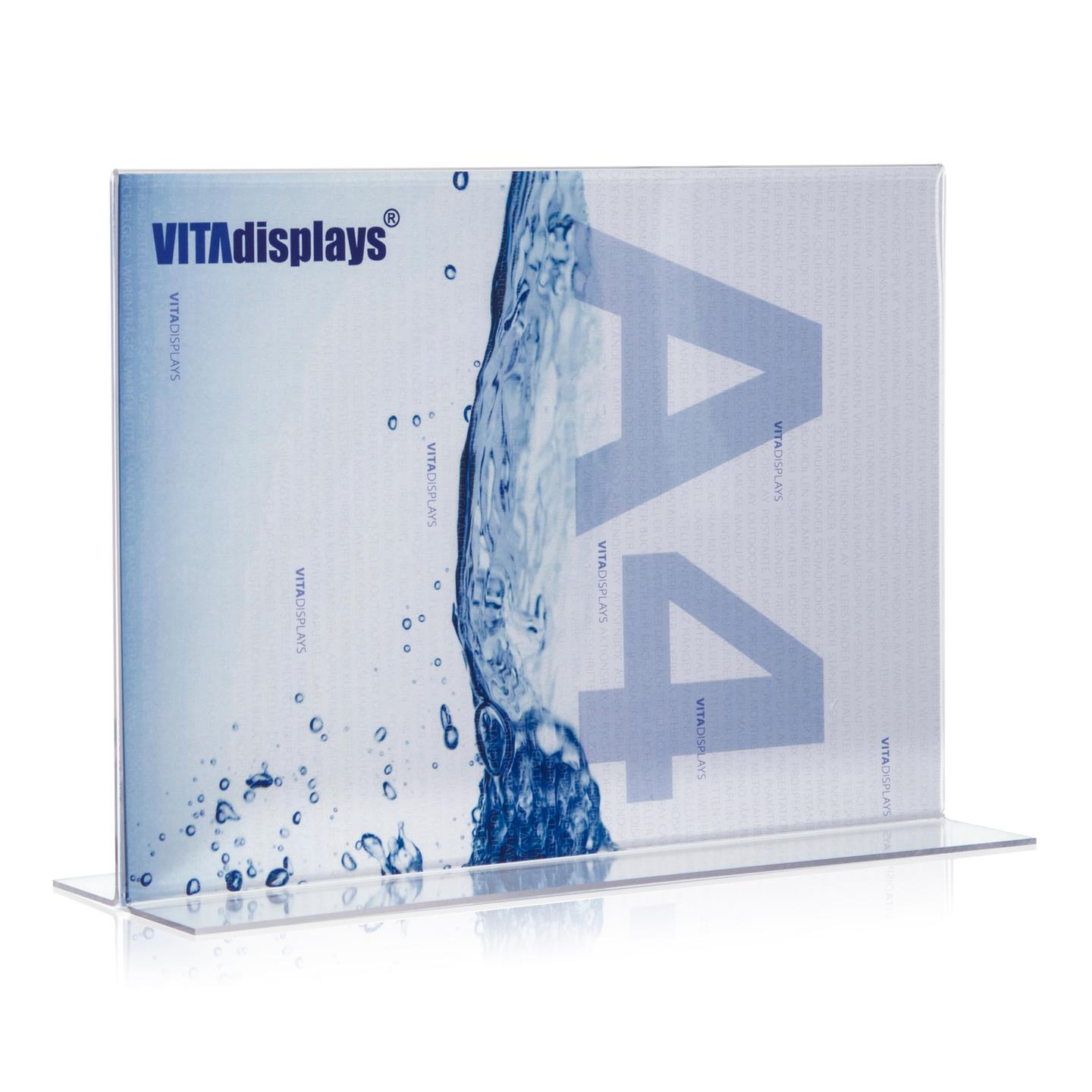 Dieser Werbeaufsteller (T-Aufsteller) im DIN A4 Querformat (T-Form) aus original PLEXIGLAS® (Acrylglas) besticht durch eine hochglänzende, qualitativ hochwertige Verarbeitung und eignet sich Bestens für die Präsentation Ihrer Werbemittel. Dieser T-Ständer aus transparentem PLEXIGLAS® ist auch als L-Ständer im Hochformat oder im Querformat erhältlich und eignet sich hervorragend als Werbemittel und Aktionsartikel für eine Bedruckung im 5C High-End Digitaldruck z. B. als Marken-Branding mit Ihrem Logo oder Firmennamen.