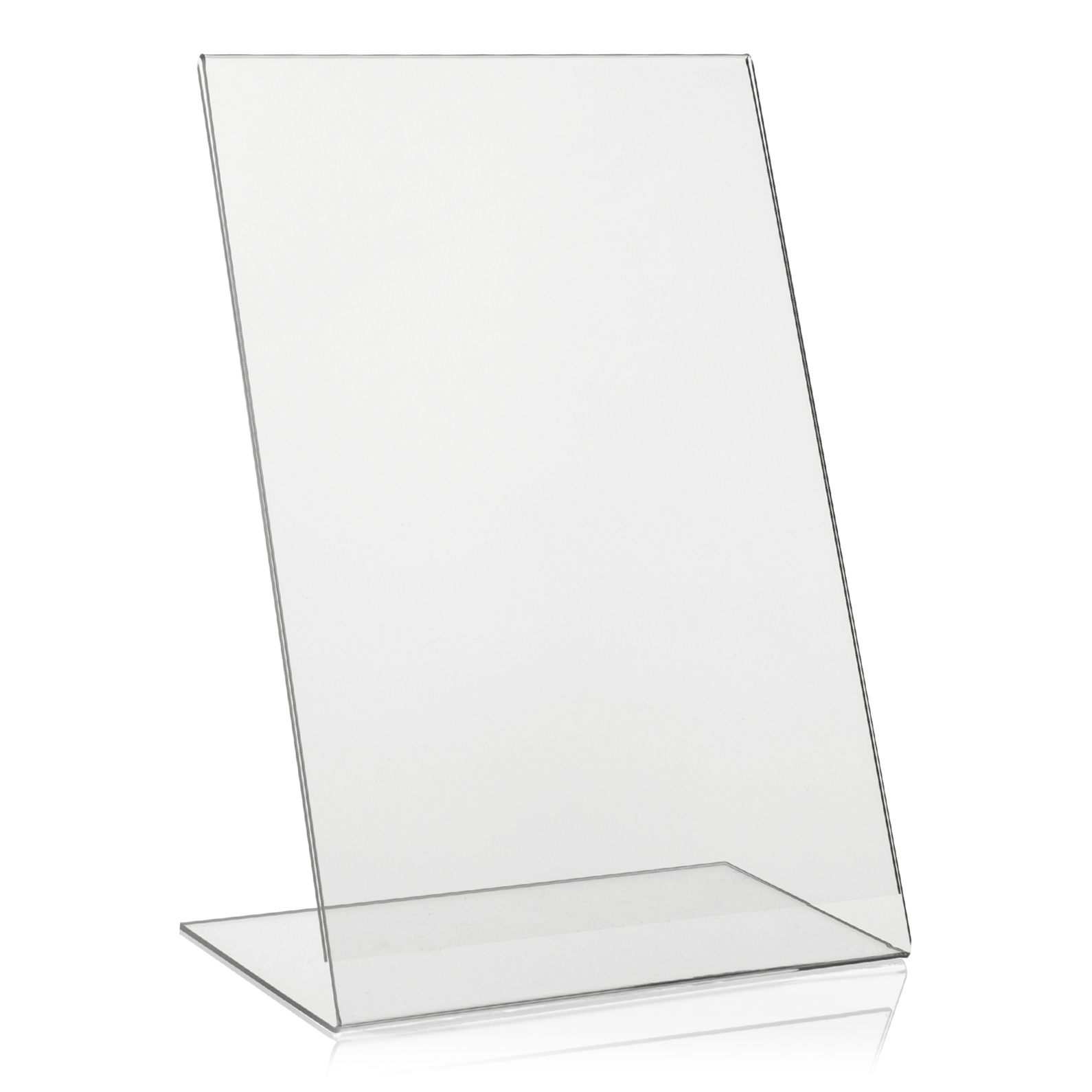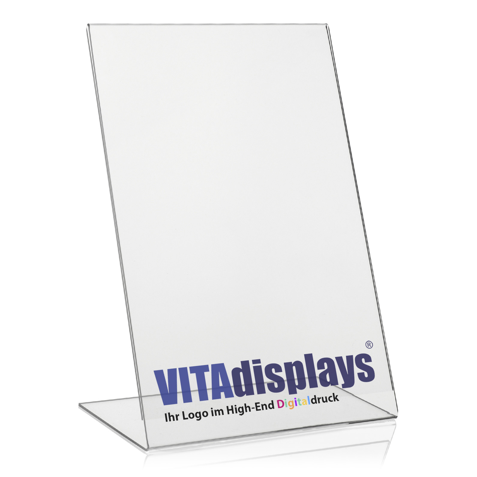 Transparente L-Ständer als Werbeaufsteller und Tischaufsteller von VITAdisplays® - Made in Germany