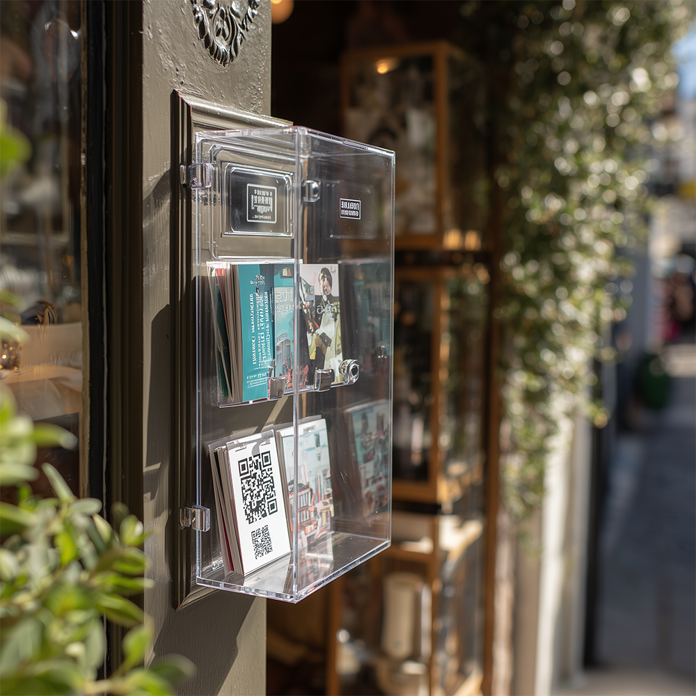 An Orten mit hohem Durchlauf und kurzer Verweildauer (Eingänge, Vitrinen, Aushänge, Musterobjekte) erzeugt der wetterfeste Visitenkartenhalter mit Deckel LA‑095 besonders niedrige Hemmschwellen: Eine Karte mitzunehmen geht schneller als einen Flyer zu studieren – perfekt für Kontaktgewinn (Telefon, QR‑Code, Terminlink).