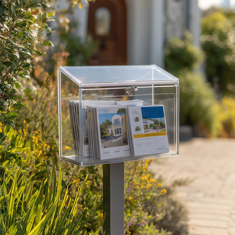 - Immobilien & Musterhäuser: A4‑Exposés direkt am Objekt; Interessenten bedienen sich selbst.
