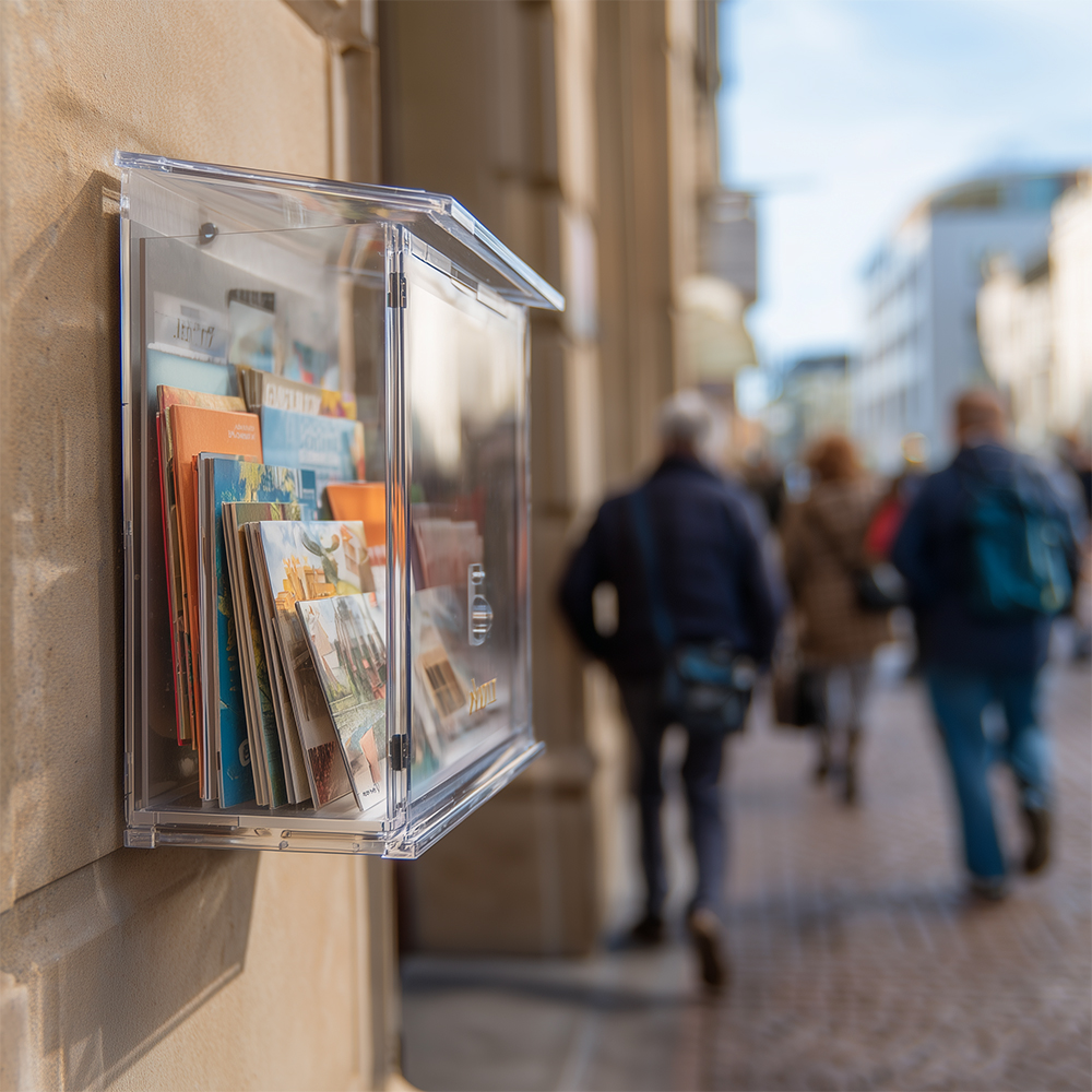 Flyer sollen wirken, auch wenn niemand am Empfang steht. Prospekthalter mit Deckel halten Informationen draußen verfügbar, schützen vor Wetter und verlängern die Reichweite Ihrer Kommunikation. Dieser Leitfaden zeigt, worauf es ankommt: Formate (DIN lang, A5, A4), Materialqualität, richtige Montage, Pflege, häufige Fehler und Einsatzszenarien … mit konkreten Checklisten und Praxistipps.