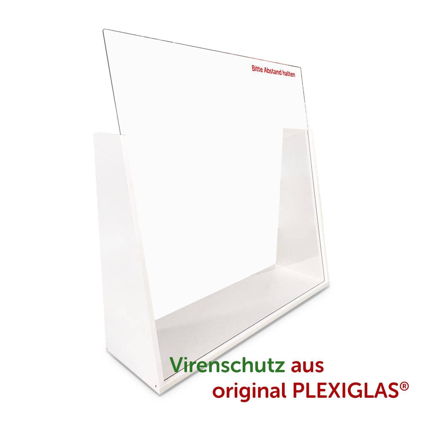 Splash guard (spit guard) as a stable, mobile counter top (decorative chipboard - white - thickness 1. 9 cm) in a width and height of 1. 0 metre, with a recessed and high-quality protective pane made of certified PLEXIGLAS® in a material thickness of 4. 0 mm. We offer you this optimal protection in the counter area with an optional passage (width 30. 0 cm / height 15. 0 cm) on the front to enable the secured sale and the protected passing of articles or documents. This sneeze guard is easy to clean and can be placed freely in the counter area. It is suitable for use in pharmacies, doctors' surgeries, hospitals or other sales outlets with open customer contact in the checkout area. We are also happy to manufacture your individual counter top or protective screens according to your desired dimensions.